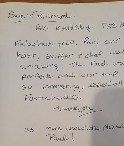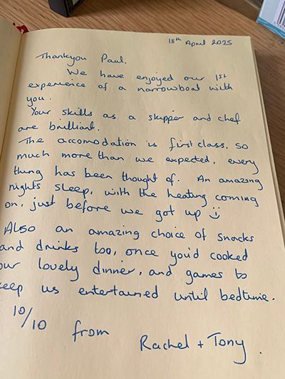 From our first encounter with Paul and his wife on a day trip to Foxton, where we met on the tow path and they invited us on board to review what they would offer for special occasions, we knew that this was something special. A booking was made and indeed we were not disappointed. The whole experience from stunning food, to a tranquil and peaceful expedition has been a joy, and Paul and his wife have been perfect hosts.