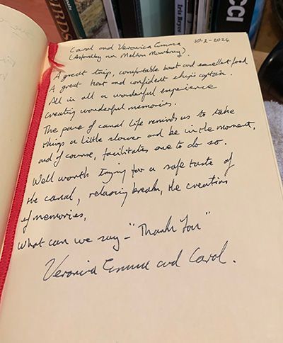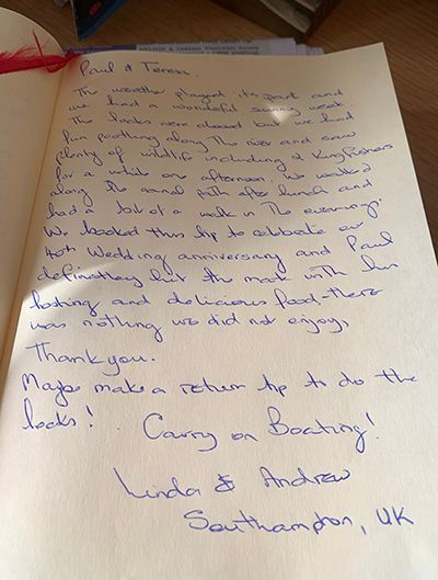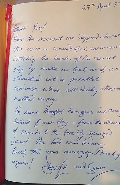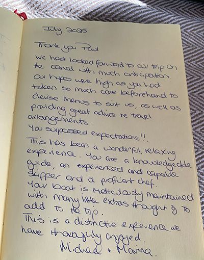 We had looked forward to our trip on the canal with much anticipation. Our hopes were high as you had taken so much care beforehand to devise menus to suit us, as well as providing great advice re. travel arrangements.