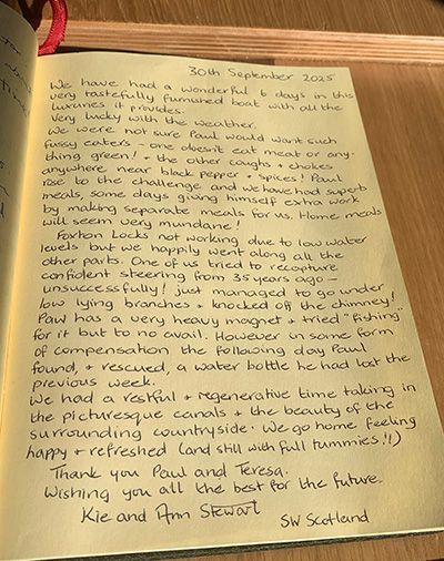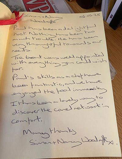Paul's skills as a chef have been fantastic, and we have enjoyed the food immensely. It has been a lovely way to discover the canal network in comfort.